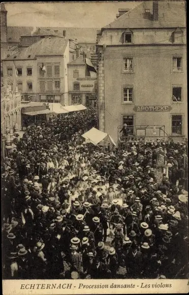 Ak Echternach Luxemburg, Procession dansante, les violons, Apotheke