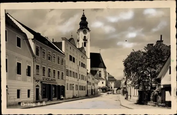 Ak Eferding in Oberösterreich, Straßenansicht, Geschäft Stadelmann, Kirchturm