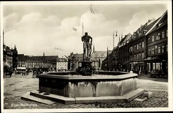 Ak Eger Erlau Ungarn, Eger Marktplatz, Brunnen mit Statue, Architektur, Straßenansicht