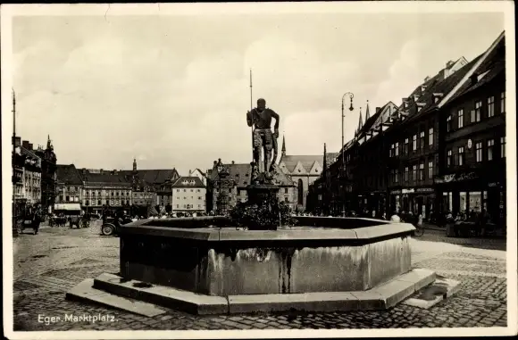 Ak Eger Reg. Karlsbad, Marktplatz, Brunnen, Läden, Häuserfassaden