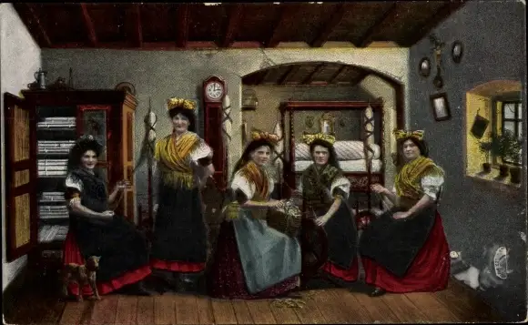 Ak Egerländer Trachten, junge Frauen in Tracht beim Spinnen