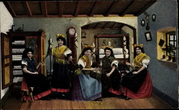 Ak Egerländer Trachten, junge Frauen in Tracht beim Spinnen