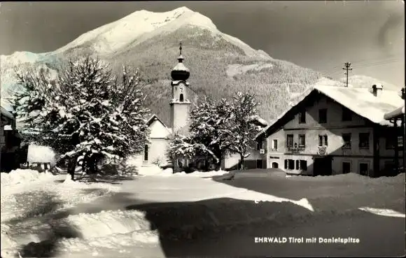 Ak Ehrwald in Tirol, Ortspartie mit Danielspitze, Kirchturm, Winter