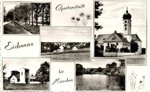 Ak Eichenau in Oberbayern, Gesamtansicht, Kirche, Kanal, See