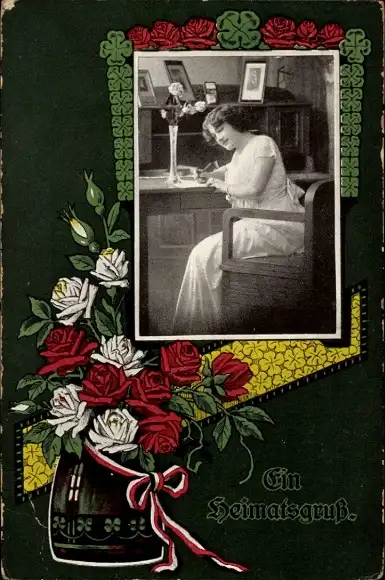 Ak Ein Heimatsgruß, Rosenstrauß, Frau schreibt einen Brief