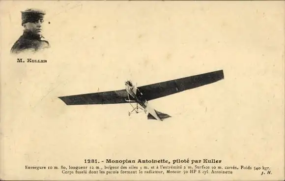 Ak Eindecker Antoinette, gesteuert von Kuller