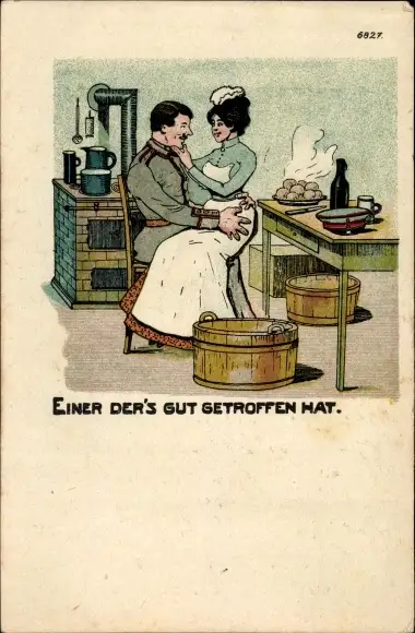 Ak Einer der's gut getroffen hat, Soldat hat Köchin auf dem Schoß