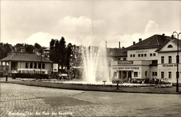 Ak Eisenberg in Thüringen, Platz der Republik, Karl Marx Lichtspiele, HO Gaststätte, Fontäne, Bus
