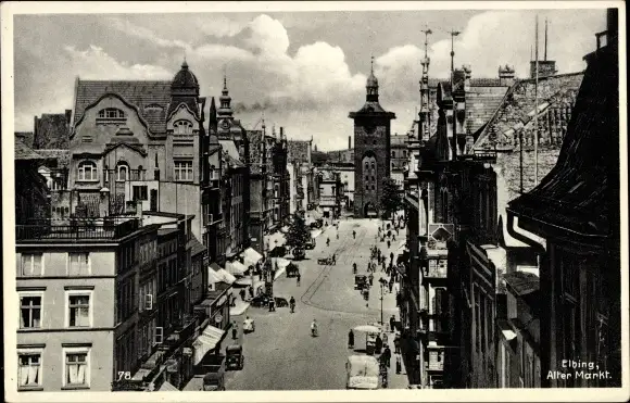 Ak Elbląg Elbing Westpreußen, Alter Markt, Uhrenturm mit Tor, Geschäfte