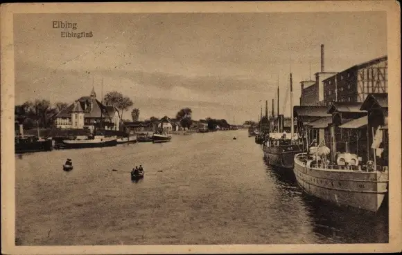 Ak Elbląg Elbing Westpreußen, Flusspartie, Gebäude