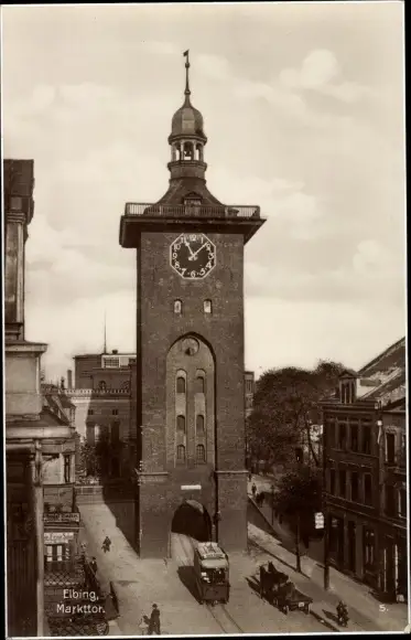 Ak Elbląg Elbing Westpreußen, Markttor, Straßenbahn