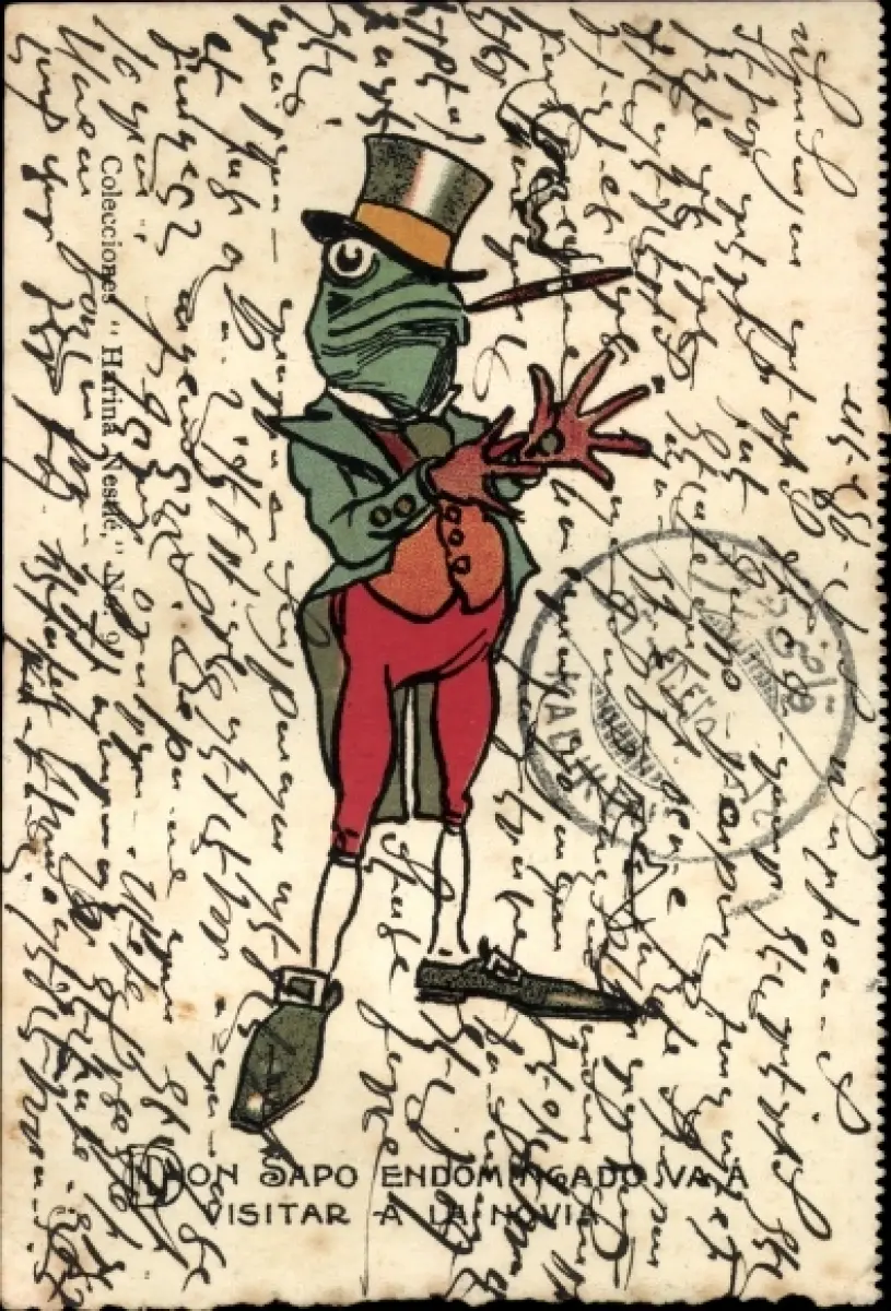 Ak Elegant gekleideter Frosch mit Zigarre, Handschuhe, Zylinder