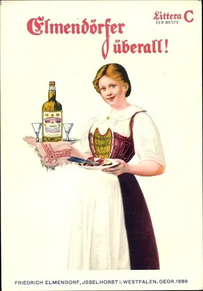 Ak Elmendörfer überall, Kornschnaps, Magd in Korsett, Littera C