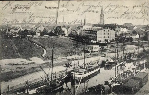 Ak Elmshorn in Holstein, Panorama, Hafen, Boote, Kirchturm