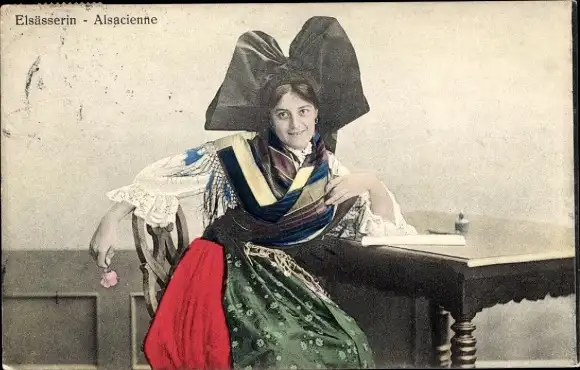 Ak Elsässerin, Alsacienne, Junge Frau in Tracht an einem Tisch, Rosenblüte
