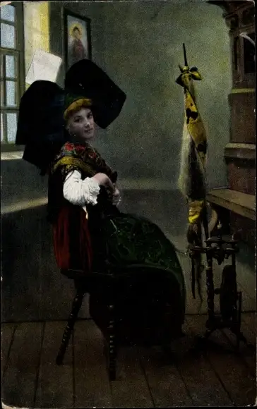 Ak Elsässerin am Spinnrad, Flügelhaube, Schultertuch