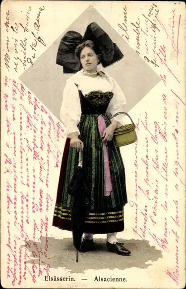 Ak Elsässerin in Tracht, Porträt, Regenschirm, Korb