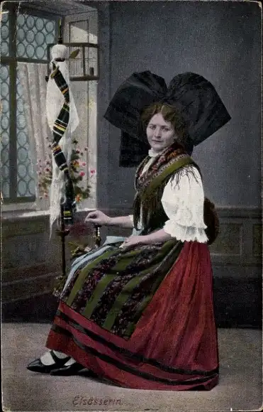 Ak Elsässerin in Volkstracht am Spinnrad, Flügelhaube