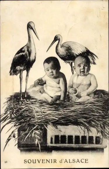 Ak Elsass, Babys und Störche im Storchennest, Fotomontage