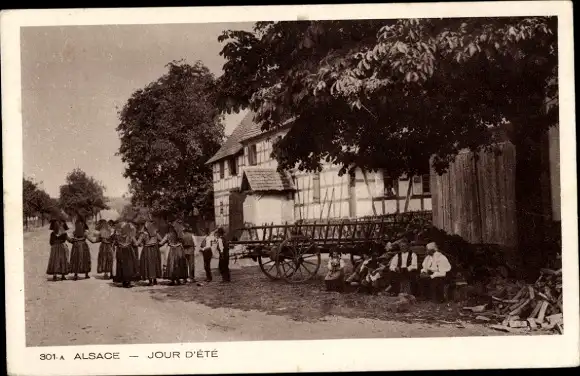 Ak Elsass, Frauen in Elsässer Trachten, Haus, Fuhrwerk