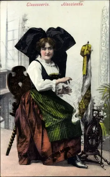 Ak Elsass Lothringen, Elsässerin in Tracht am Spinnrad