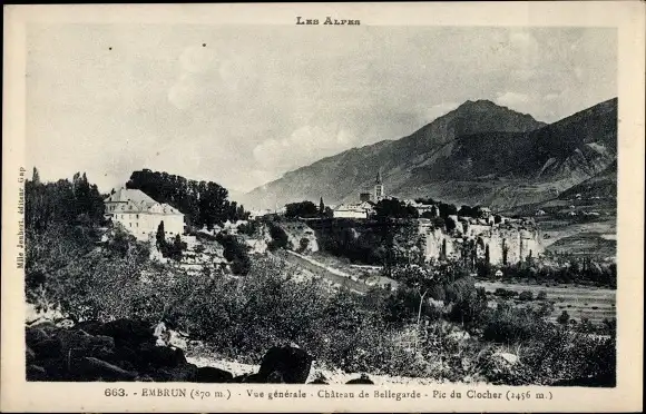Ak Embrun Hautes-Alpes, Vue generale, Chateau de Bellegarde, Pic du Clocher