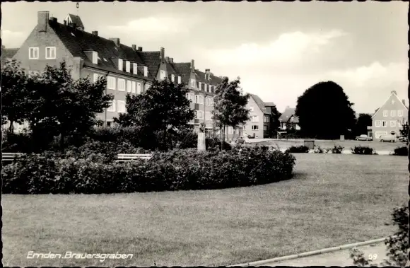 Ak Emden in Ostfriesland, Brauersgraben, Wohnhäuser, Denkmal, Grünanlage