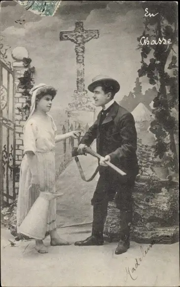 Ak En Chasse, Jäger und junge Frau, Wasserträgerin, Jagdwaffe