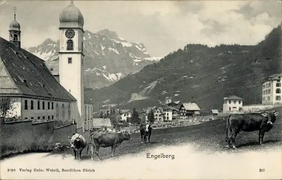 Ak Engelberg Kanton Obwalden Schweiz, Teilansicht, Kirche, Kühe