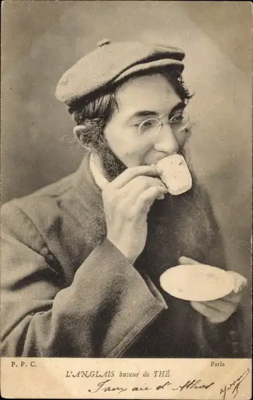 Ak England, Mann trinkt Tee, Teetasse, Teller, Hut, Portrait