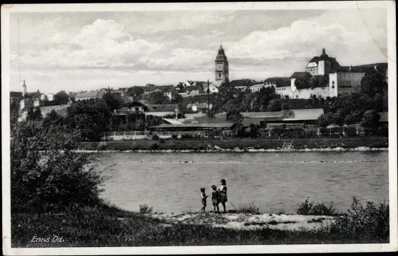 Ak Enns in Oberösterreich, Teilansicht, Kinder am Ufer