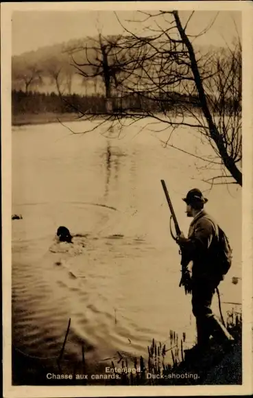 Ak Entenjagd, Jäger mit Gewehr, Teich