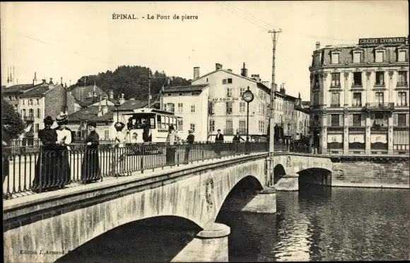 Ak Épinal Lothringen Vosges, Le Pont de pierre, Straßenbahn auf der Brücke