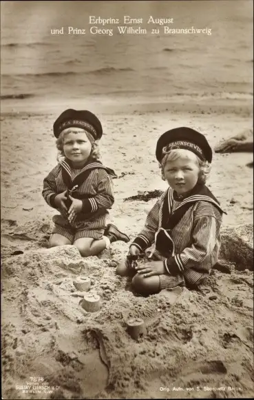 Ak Erbprinz Ernst August und Prinz Georg Wilhelm zu Braunschweig, Am Strand, Matrosenanzüge
