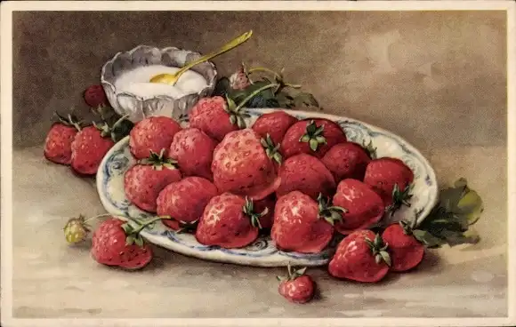 Ak Erdbeeren, Teller, Zucker, Früchte