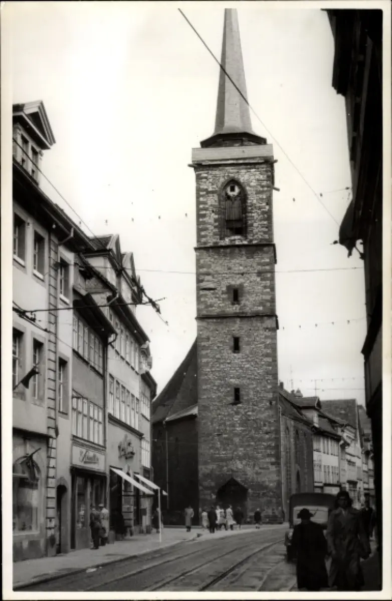 Ak Erfurt in Thüringen, Geschäfte, Passanten, Kirchturm