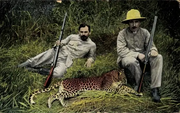 Ak Erlegter Leopard, Ost Afrika, Zwei Jäger, Kolonialzeit