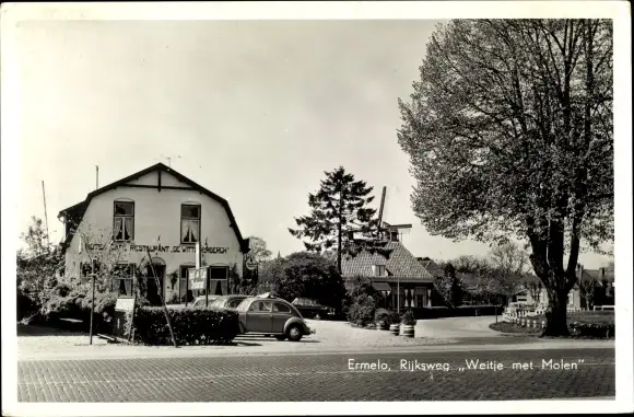 Ak Ermelo Gelderland, Rijksweg, Weitje met Molen