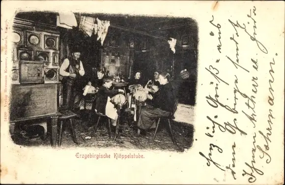 Ak Erzgebirge, Klöppelstube, Kachelofen