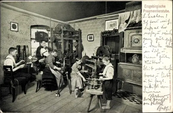 Ak Erzgebirgische Posamentierstube, Flechtmaschine