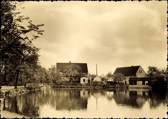 Ak Eschefeld Frohburg in Sachsen, Blick über das Wasser, Fachwerkhaus