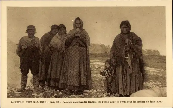 Ak Eskimo Missions, Eskimofrauen, die Felle braun