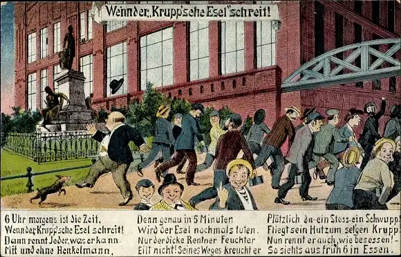 Ak Essen, Wenn der Krupp'sche Esel schreit, Fabrikarbeiter auf dem Weg zur Arbeit