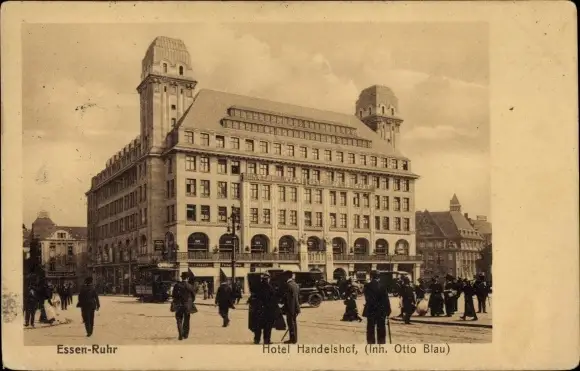 Ak Essen im Ruhrgebiet, Hotel Handelshof, Autos, Straßenbahn, Passanten