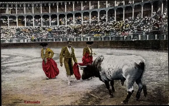 Ak Estocada, Stierkampf in der Arena, Toreros, Rotes Tuch