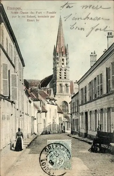 Ak Étampes Essonne, Notre-Dame-du-Fort, Kirche, Straßenpartie