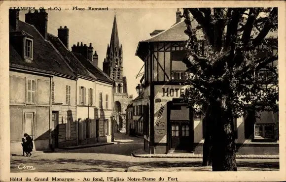 Ak Étampes Essonne, Place Romanet, Hotel du Grand Monarque, Eglise Notre-Dame du Fort