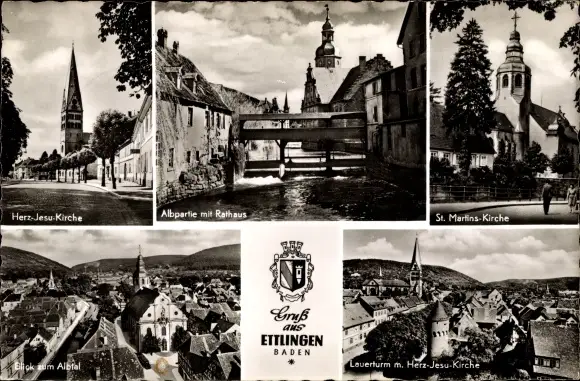 Ak Ettlingen in Baden, Herz Jesu Kirche, Rathaus, St. Martinskirche