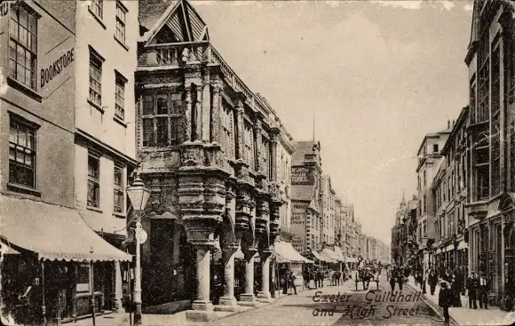 Ak Exeter Devon England, Guildhall, Bookstore, Straßenszene mit Menschen und Kutschen