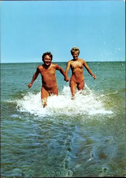 Ak FKK Urlauber am Strand, Nackt durch das Wasser laufend